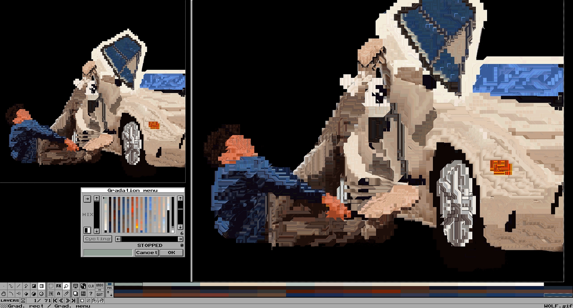 I was initially drawn to graphics similar to those used in works on Tezos. Then, as I mentioned earlier while discussing art and software with friends, they introduced me to the wonderful software Grafx2, which I both love and hate. This is because in 1996, the concept of ‘user-friendly’ was not common.